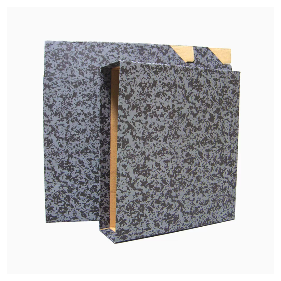 Caixa em cartão microcanelado, desmontável, forrada a papel litografado nuvem.