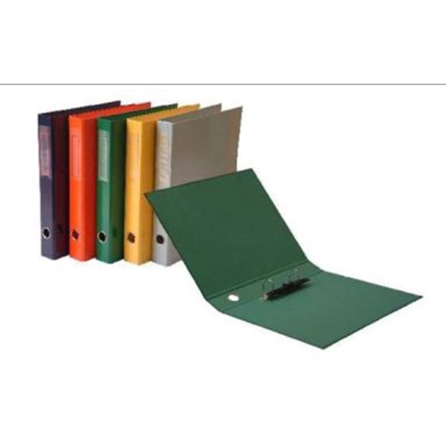 Arquivador no formato comercial (A4) em cartão forrado a papel litografado plasticizado. Com lombada larga (4 cm), colorida e ferragem de alavanca. Calcador em plástico. A lombada tem porta etiqueta e óculo. A frente da pasta inclui ranhuras de apoio à ferragem, que permitem que a pasta se mantenha equilibrada, dispensando caixa Embalagem com 10 unidades