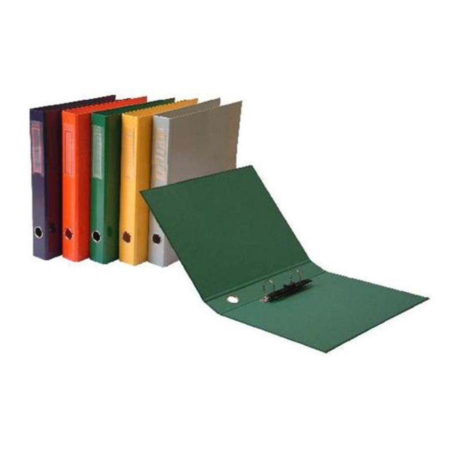 Arquivador no formato comercial (A4) em cartão forrado a papel litografado plasticizado. Com lombada larga (4 cm), colorida e ferragem de alavanca. Calcador em plástico. A lombada tem porta etiqueta e óculo. A frente da pasta inclui ranhuras de apoio à ferragem, que permitem que a pasta se mantenha equilibrada, dispensando caixa Embalagem com 10 unidades