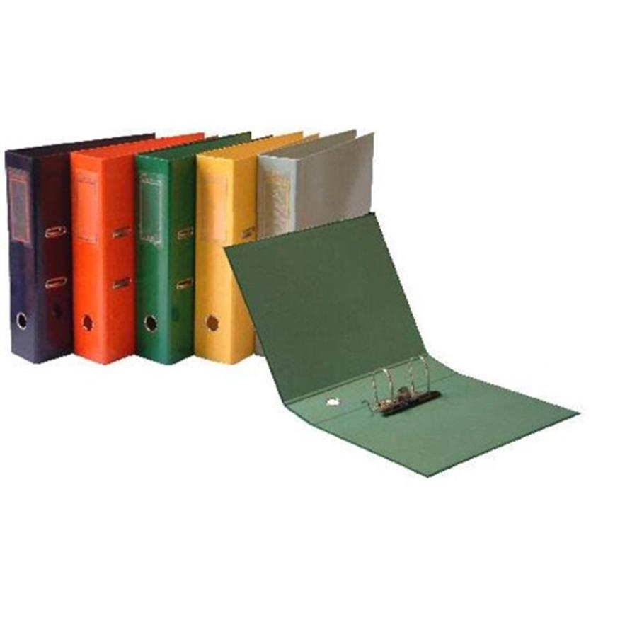 Arquivador no formato comercial (A4) em cartão forrado a papel litografado plasticizado. Com lombada larga (8 cm), colorida e ferragem de alavanca. Calcador em plástico. A lombada tem porta etiqueta e óculo. A frente da pasta inclui ranhuras de apoio à ferragem, que permitem que a pasta se mantenha equilibrada, dispensando caixa Embalagem com 10 unidades
