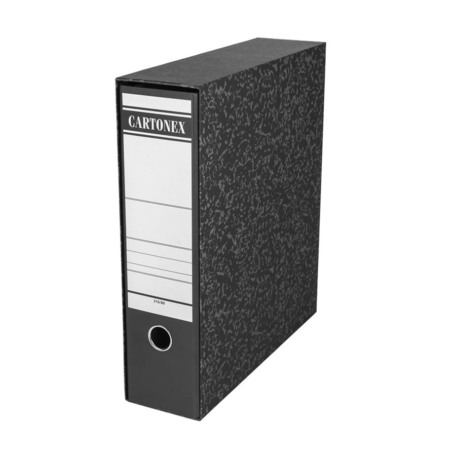 Pasta de arquivo COM CAIXA fixa em fibra de cartão revestido em papel litografado.