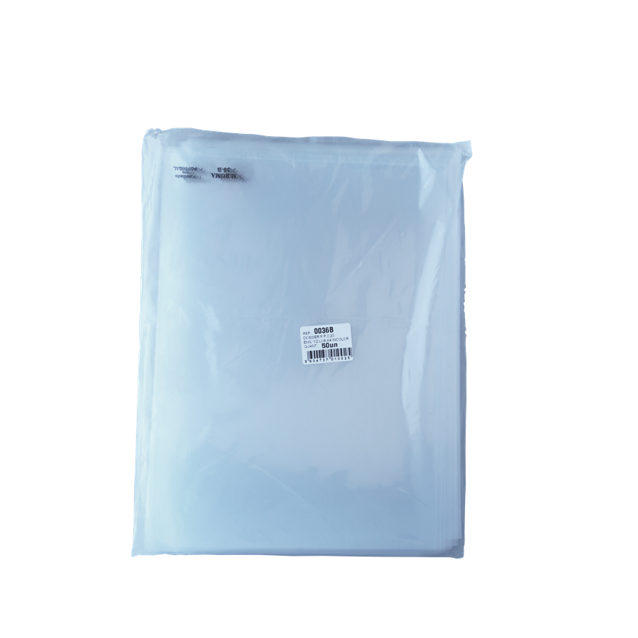 ROMA 36-B - BOLSA EM L CRISTAL (EMB.C/50) Bolsa em polipropileno cristal incolor com meia-lua no formato A4, abertura ao baixo Bolsa polipropileno 0,20 microns Embalagem com 50 unidades.