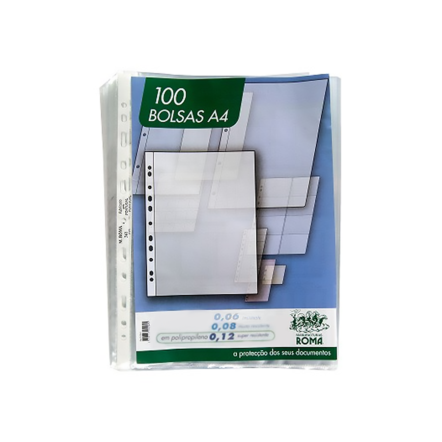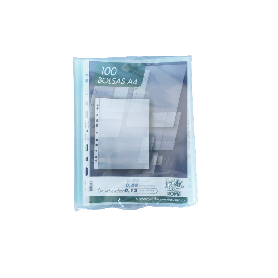 BOLSA CATALOGO ROMA 193 (EMB.C/100) Espessura 120 microns em cristal, anti estática, abertura no topo e banda lateral reforçada com perfuração universal. Formato A4 Embalagem c/100 unidades.