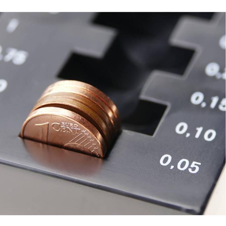 Classificador de moedas EURO, com colunas graduadas (impressas) com o total de cada uma das moedas.