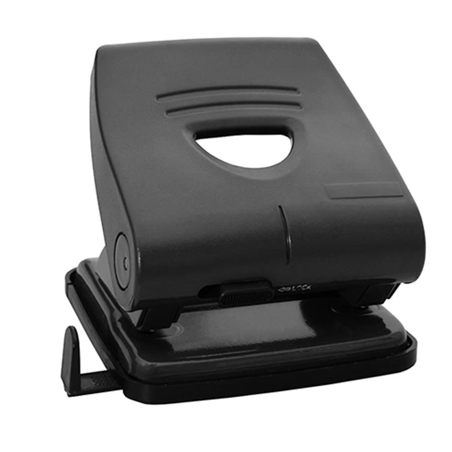 Perfurador de estrutura metálica com tampa plástica, 2 furos, marcador central, base anti deslizante com reservatório para papel perfurado e régua marginadora. Capacidade para furar ate 30 folhas