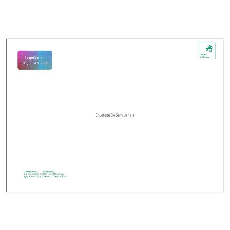 ENVELOPE C4 SEM JANELA COM PALA AUTODEX Este serviço pressupõe que o cliente forneça a arte final em programa de desenho editável (ex.: PDF, Illustrator, Corel Draw), bem como as respectivas fontes e indicação dos Pantones. Personalizado a 3/0 cores Quantidade = 1.000 unidades (1 MLH) Quantidades superiores sujeito a orçamento prévio.